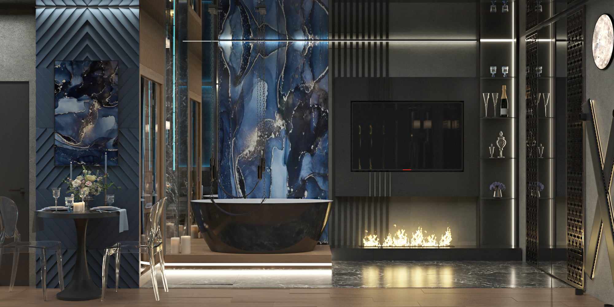 Wchodząc do apartamentu, od razu poczujesz atmosferę spokoju i wyrafinowania, wzbogaconą o niesamowity widok na ścianę z minerałów i kamieni szlachetnych, która emanuje subtelnym blaskiem, tworząc przytulną aurę. Fotel do masażu oraz elegancki szezlong zapraszają do relaksu, a delikatne huśtanie się na specjalnej huśtawce doda pikanterii każdej chwili.